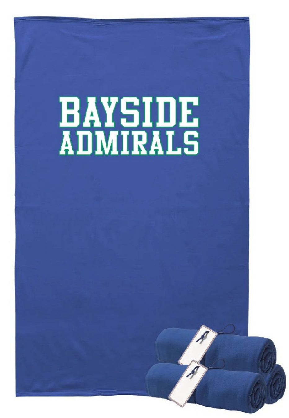 Stay warm with this custom Bayside Academy sweatshirt blanket. Royal blanket with Bayside Admirals in white letters outlined in green.